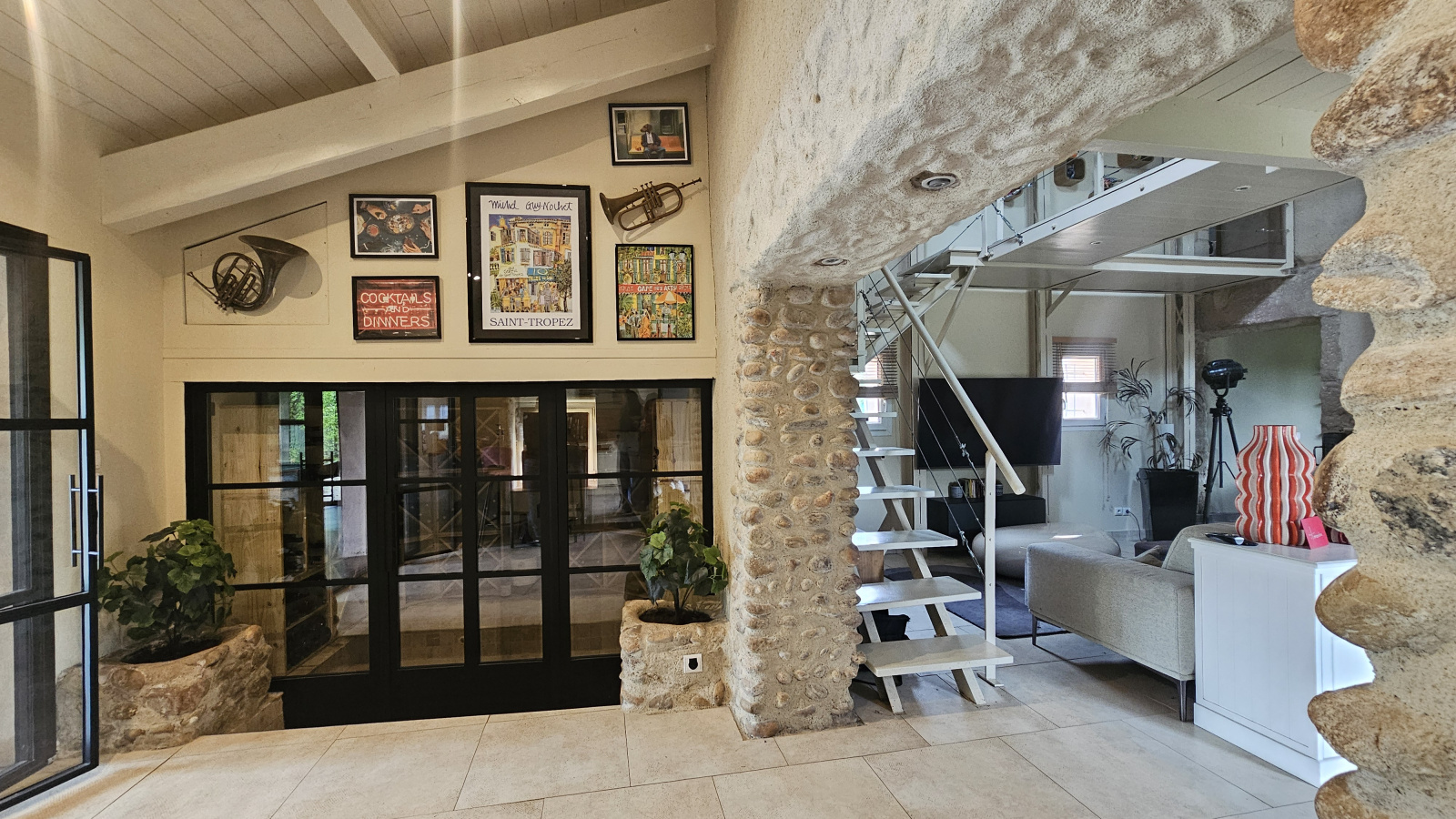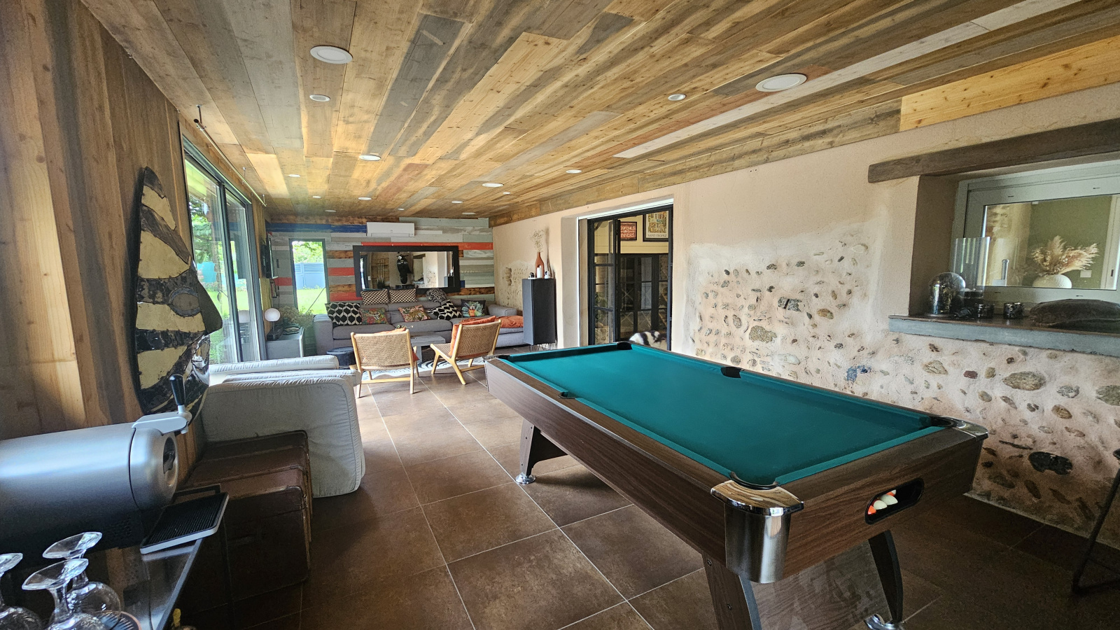 En Rez-de-chaussée, vous disposerez d'un salon véranda orienté par de grandes baies vitrées à galandages sur le jardin et la piscine, une cuisine ouverte sur un espace chaleureux avec un salon équipé d'une cheminée, cave à vin, salle à manger, et une suite parentale de plus de 20m2 avec son entrée indépendante.