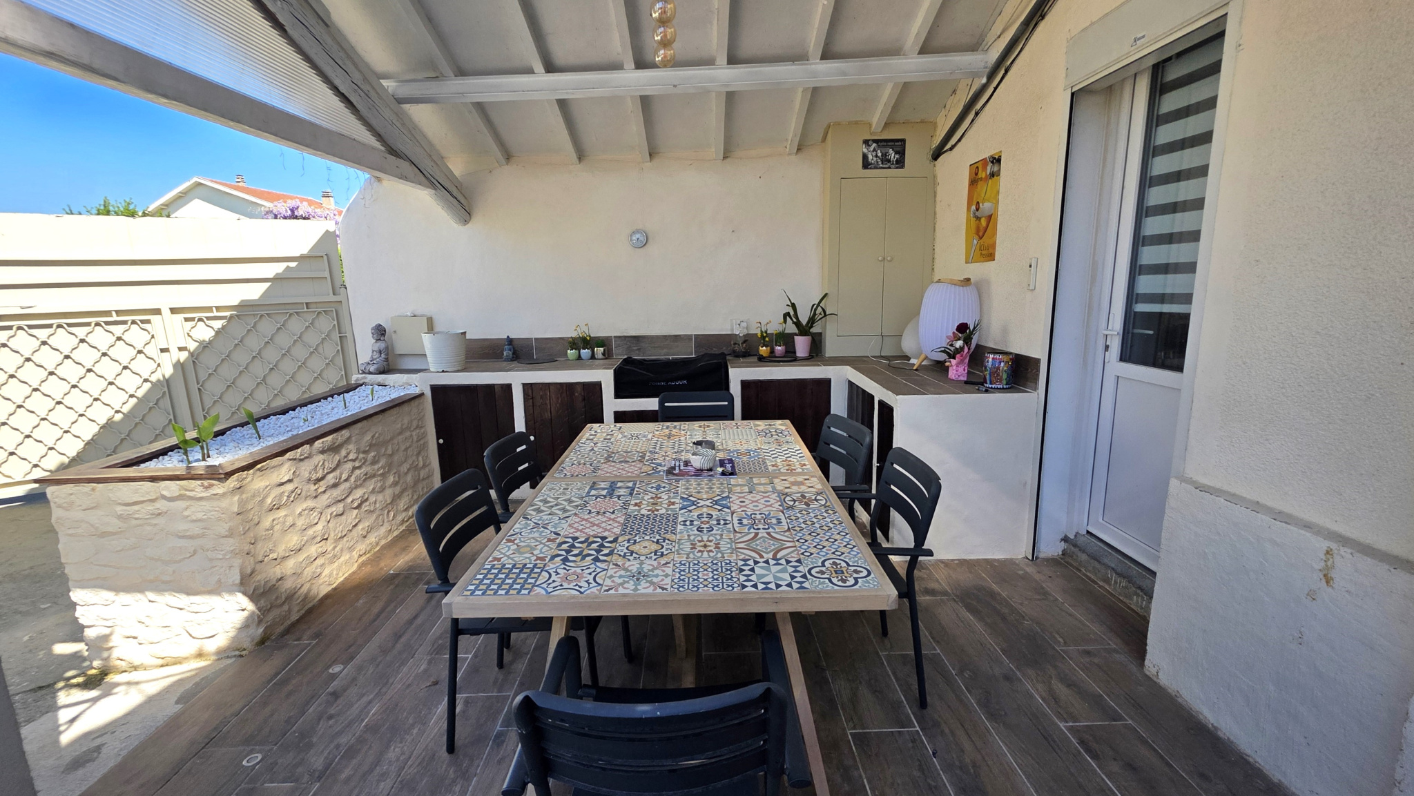 Enfin, lors de vos soirées estivales vous profiterez sous la glycine d'un bel espace aménagé avec cuisine d'été, qui se prolonge toujours dans une atmosphère conviviale d'une terrasse.