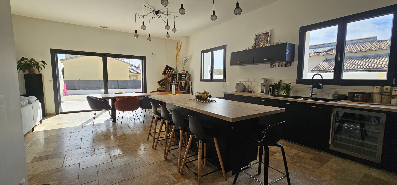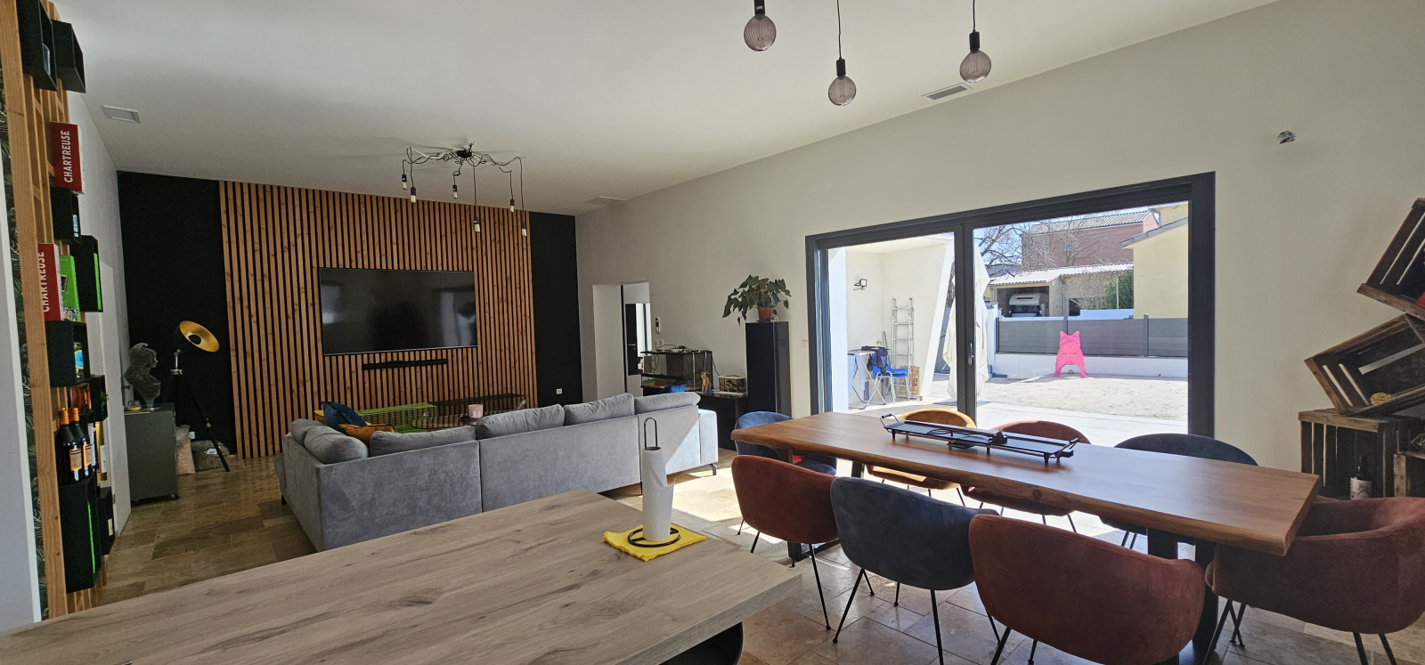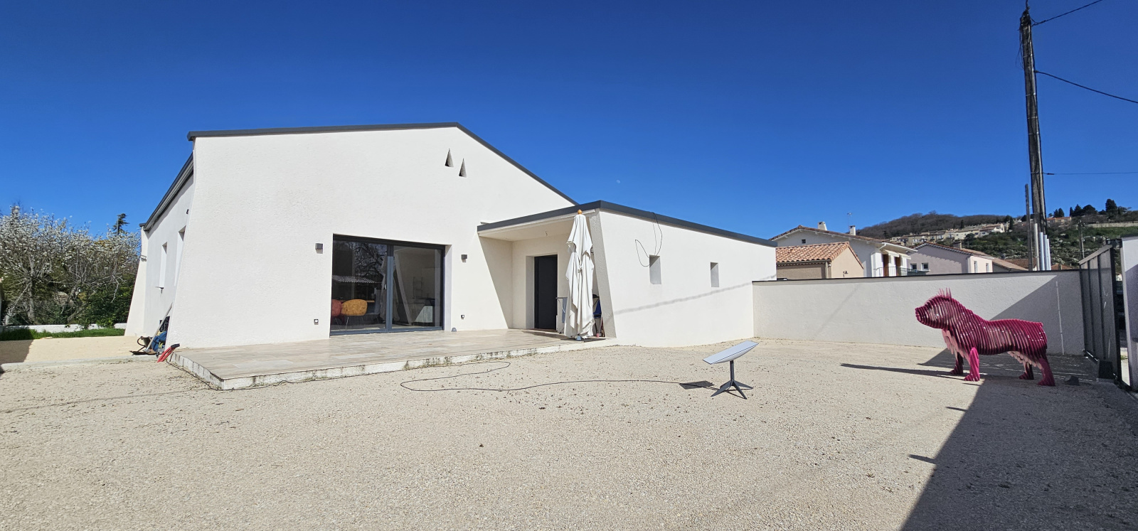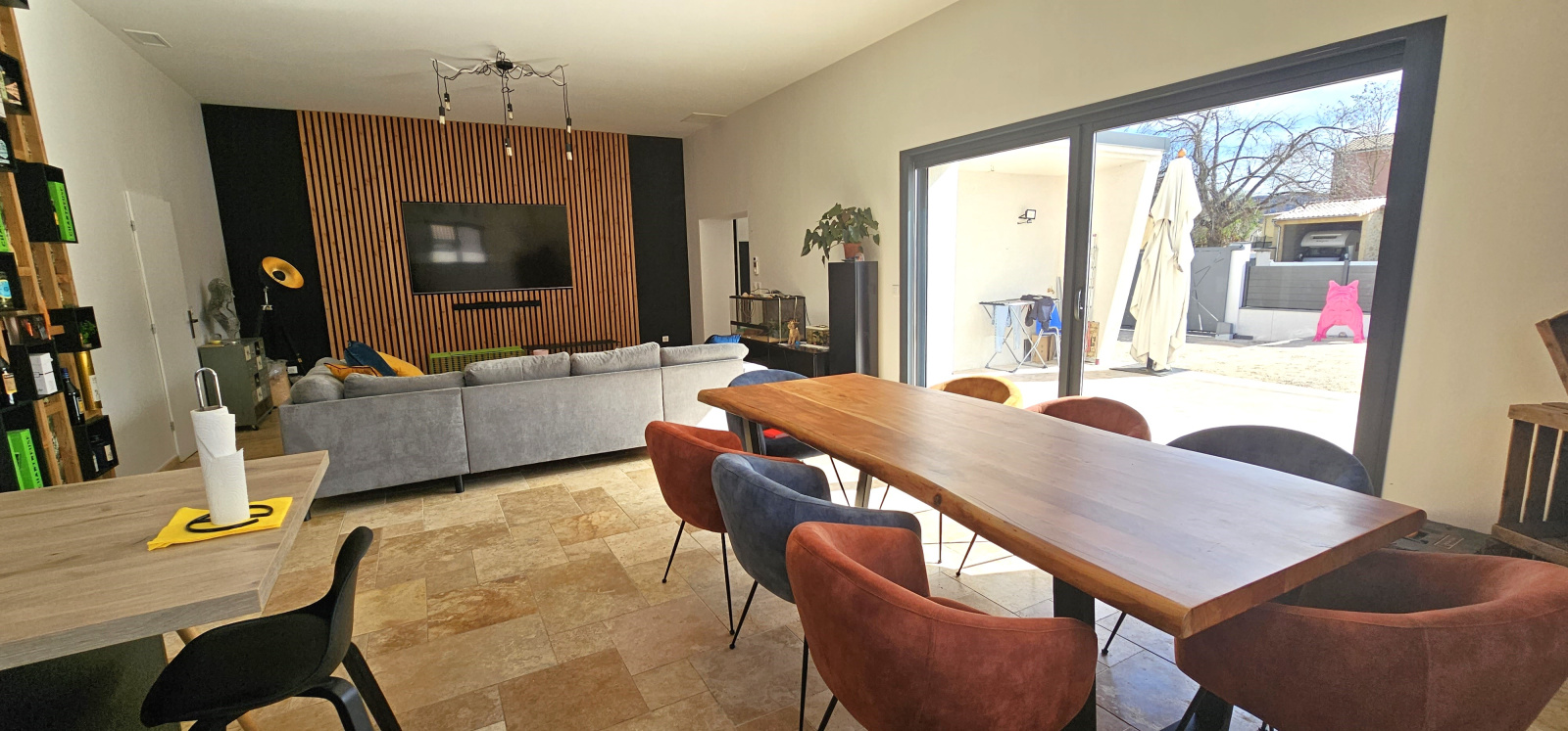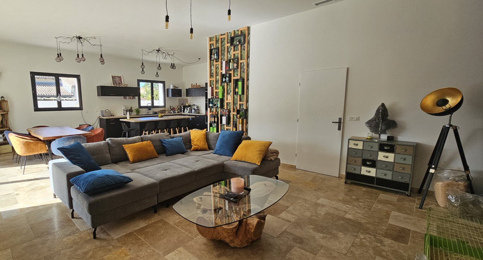 Livron-sur-Drôme (26250)Proche de toutes commodités, vous aprécierez d'avoir une grande pièce de vie de 69m2 avec cuisine équipée ouverte sur séjour /salle à manger et orientée par une grande baie vitrée à galandage sur une terrasse en travertin exposée Sud.