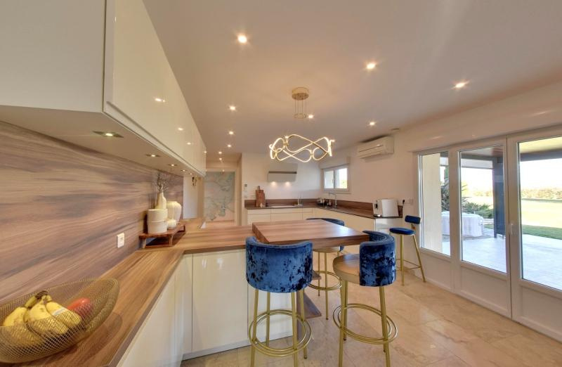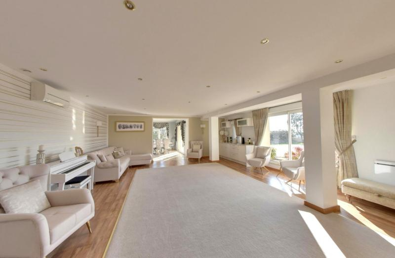 Au rez-de-chaussée, vous apprécierez ses espaces de vie comprenant une grande entrée desservant un salon/salle à manger de 80m2, une cuisine entièrement équipée de 23m2, ainsi qu'un cellier, salle d'eau, WC, mais aussi une chambre de 14m2.