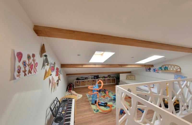 Au second étage les combles ont été aménagées et comprennent une chambre mansardée, une salle de jeux, salle de bains avec WC et grenier.